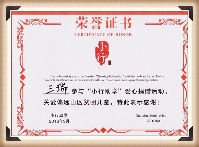 在贵州省毕节市亮岩镇的亮岩小学和太极小学这两所希望小学里,绝大多数孩子都是留守儿童。2015年10月,在民间公益团体“小行助学”发起的公益助学项目中,上海三瑞高分子材料股份有限公司、汉高粘合剂有限公司上海分公司和上海塞层实业有限公司来到亮岩镇,免费为两所小学做了活动中心的地坪。汉高提供面层自流平材料,塞层实业负责自流平施工,三瑞高材提供聚氨酯涂层并负责涂层施工。地坪做好后,受到学校老师和学生的一致好评。日前,“小行助学”代表两所小学向三瑞高材颁发了荣誉证书,对三瑞参与爱心捐赠、关爱偏远山区贫困儿童表示感谢。