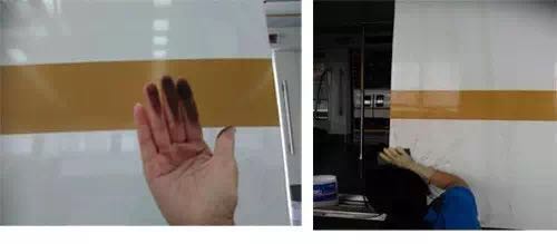 地铁长期在地下隧道运行,隧道内壁上时常会滴入一些岩浆液、矿物液等黑色的污垢沾附在地铁外车厢的表面,这些污垢普通的清洁剂根本除不干净,我们建议用蓝色强力除蜡水和唯特水性除油剂复配,然后再1:6兑水清洗,效果很好。(见下图)