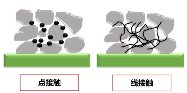 碳纳米管(CNTs)是一种径向尺寸为纳米量级,轴向尺寸为微米量级的特殊结构的一维量子材料,具有良好的电子导电性,能够形成连续的导电网络,导电性能远远优于传统导电材料。但是由于CNTs的管层之间存在较强的范德华力,自身又具有极大的比表面积和高长径比的特性,使得CNTs在通常情况下均以缠绕团聚的形式存在,其均匀分散非常困难,尤其是在高固含量时,浆料易在储存过程中会发生凝胶化问题,因此要发挥其优异性能,使之得到广泛的应用,对CNTs均匀分散成为了首要需要解决的关键性问题。