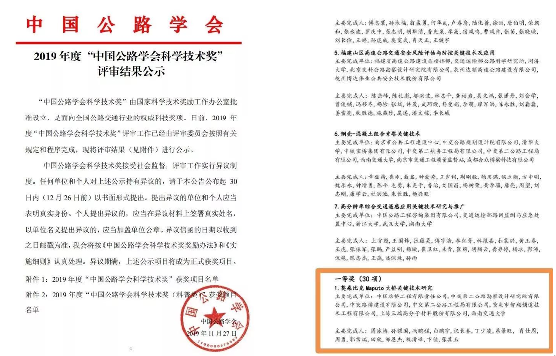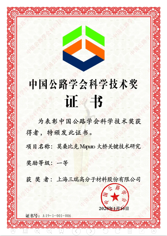 目前,我单位参与的莫桑比克Maputo大桥关键技术研究项目喜获中国公路学会科学技术奖一等奖,这是三瑞企业2019年度获得国家级学会奖级别最高的一次奖励。这次奖励的获得表明我单位的科技成果在聚羧酸系高性能减水剂、及混凝土外加剂产品的产学研合作、创新方面均具有一定的影响力。