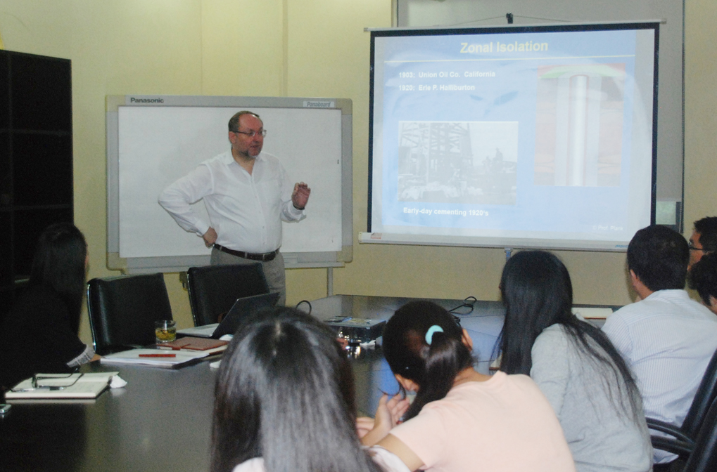 3日上午,在总经理傅乐峰博士的主持下,学术交流会议顺利召开。会中,Plank教授作了“Oil well cementing(油井水泥)”的报告,报告内容丰富,涉及油井行业发展、钻固井工艺、固井水泥浆外加剂等内容,使大家受益匪浅。